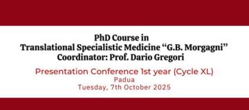 I dottorandi del I anno (Ciclo XL) sono impegnati a presentare la propria attività di ricerca con una presentazione powerpoint e in lingua inglese, in Archivio Antico del Palazzo del Bo.A fine giornata, ore 17:00, il Prof. Gaetano Thiene, Professore Emerito dell'Università degli Studi di Padova,